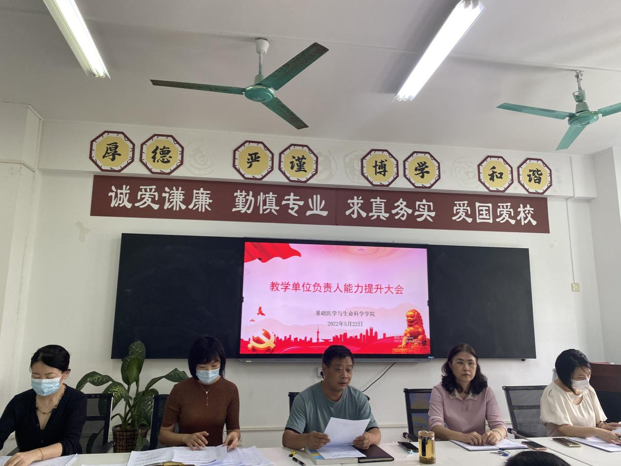 2022年5月22日上午9时,基础医学与生命科学学院在综合楼北402举行“教学单位负责人能力提升大会”,会议由易西南院长主持,王晗书记、杨文君副院长、朱明月副院长、莫燕娜副院长、学院教学办公室、各教研室、实验室主任、副主任及教学秘书参加会议。