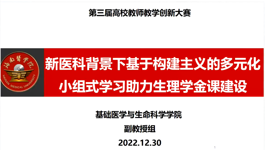 2022年12月30日上午9时,基础医学与生命科学学院在综合楼北402举行“教学大赛获奖教师经验分享沙龙”,此次会议采用线上线下相结合的方式,主题为“创新教学比赛打磨会”。会议由杜冠魁副院长主持,学院教学办公室、各参赛团队参加会议。