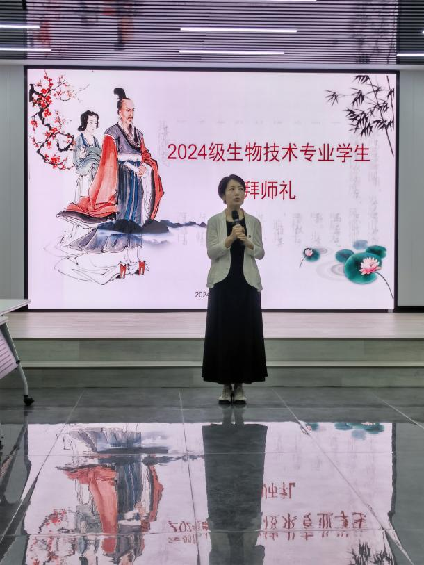 教师代表冯玮发言表达对学生的殷切期望,表示会全力指导学生学业和科研,希望他们保持好奇与求知欲,勇于探索未知,为生物技术事业发展贡献力量。学生代表徐丽媛发言表达对学院的感激和对未来的憧憬,表示会牢记导师教诲,珍惜学院条件,努力学习专业知识,积极参与实践,提升综合素质,为成为优秀生物技术人才而奋斗。
