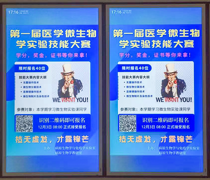 此次大赛分为初赛和复赛,初赛采取线上考试的方式,主要考察微生物操作的基本理论知识。复赛考察医学微生物实验技能,更加侧重操作的规范性,熟练程度,细节等。此次大赛采取了多种现代化教育技术手段进行操作,例如通过智能云屏宣传本次活动,营造比赛气氛;以雨课堂的形式进行命题以及改卷,参赛选手只需通过手机简单扫描进行线上作答即可。另外,借助实验室新建立的5G显微成像互动系统,学生可实时上传结果图到教师端,相较于以往传统显微镜观察的形式,该系统成像清晰,不仅提升了观察效果及效率,同时提高了结果评阅的准确性和公正性。