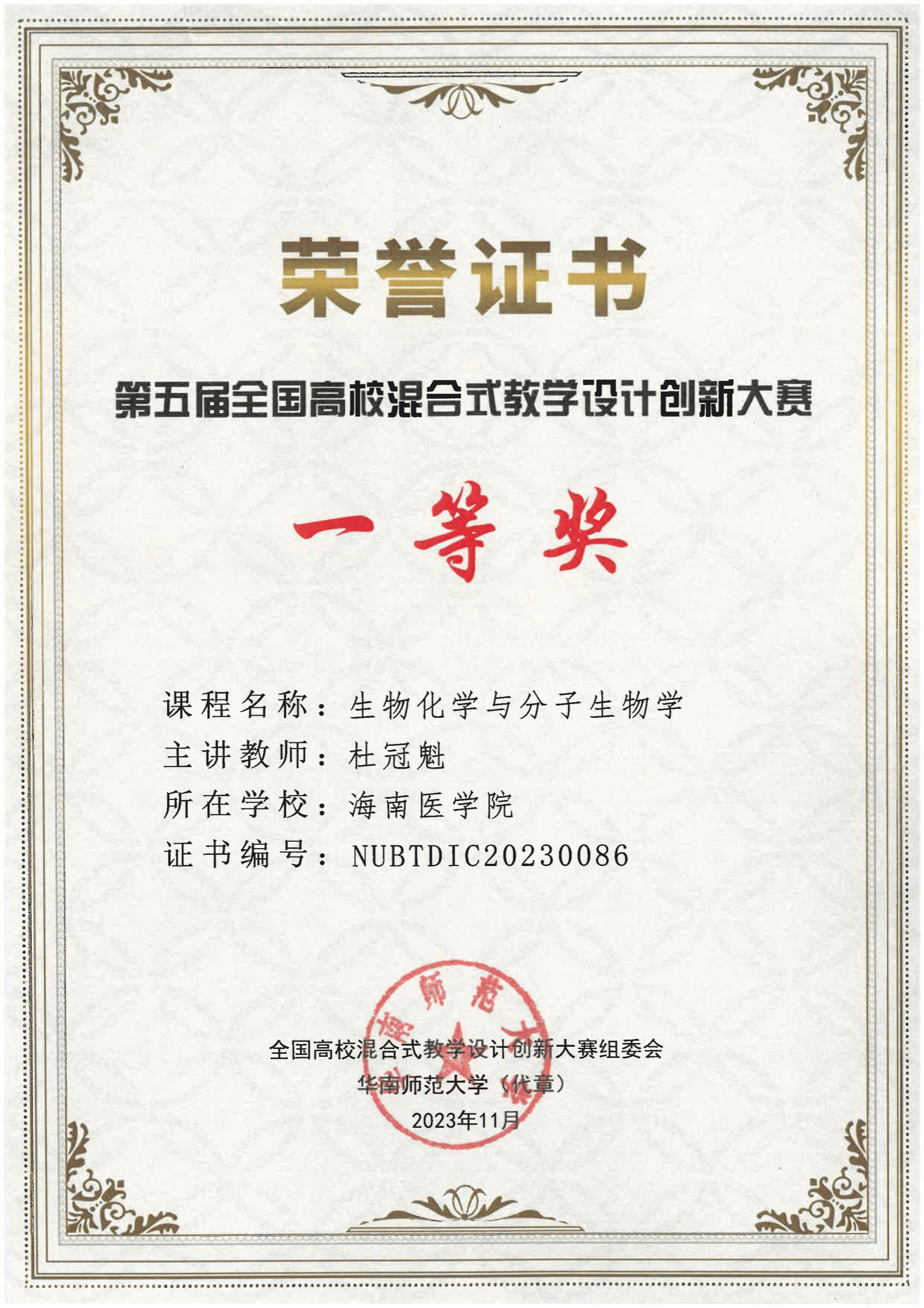 第五届全国高校混合式教学设计创新大赛全国现场决赛于2023年11月10日-11月12日在华南师范大学举行。taptap点点生物化学与分子生物学教研室教师杜冠魁在全国第五届混合式设计教学大赛中斩获一等奖。生物化学与分子生物学课程教学团队一直以来都致力于混合式教学设计的研究和实践,积极探索新的教学方式,将传统课堂与线上学习相结合,以激发学生的学习兴趣和主动性。此次在全国混合式设计教学大赛中荣获一等奖,是课程教学团队多年来的辛勤付出的结果,也体现了taptap点点对教育教学改革的坚定决心和积极实践。taptap点点将继续鼓励和支持教师们进行教学创新,以提升整体教学质量,培养出更多优秀的人才。