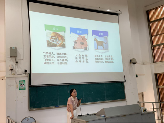 牛莉娜教授用“虎头---猪肚---豹尾”的比喻,结合自身教学水平提高的经验,给青年教师做了课程教学设计的讲座,将授课过程中的课堂设计方式、方法、素材、切入点等内容形象生动的展示给了大家。