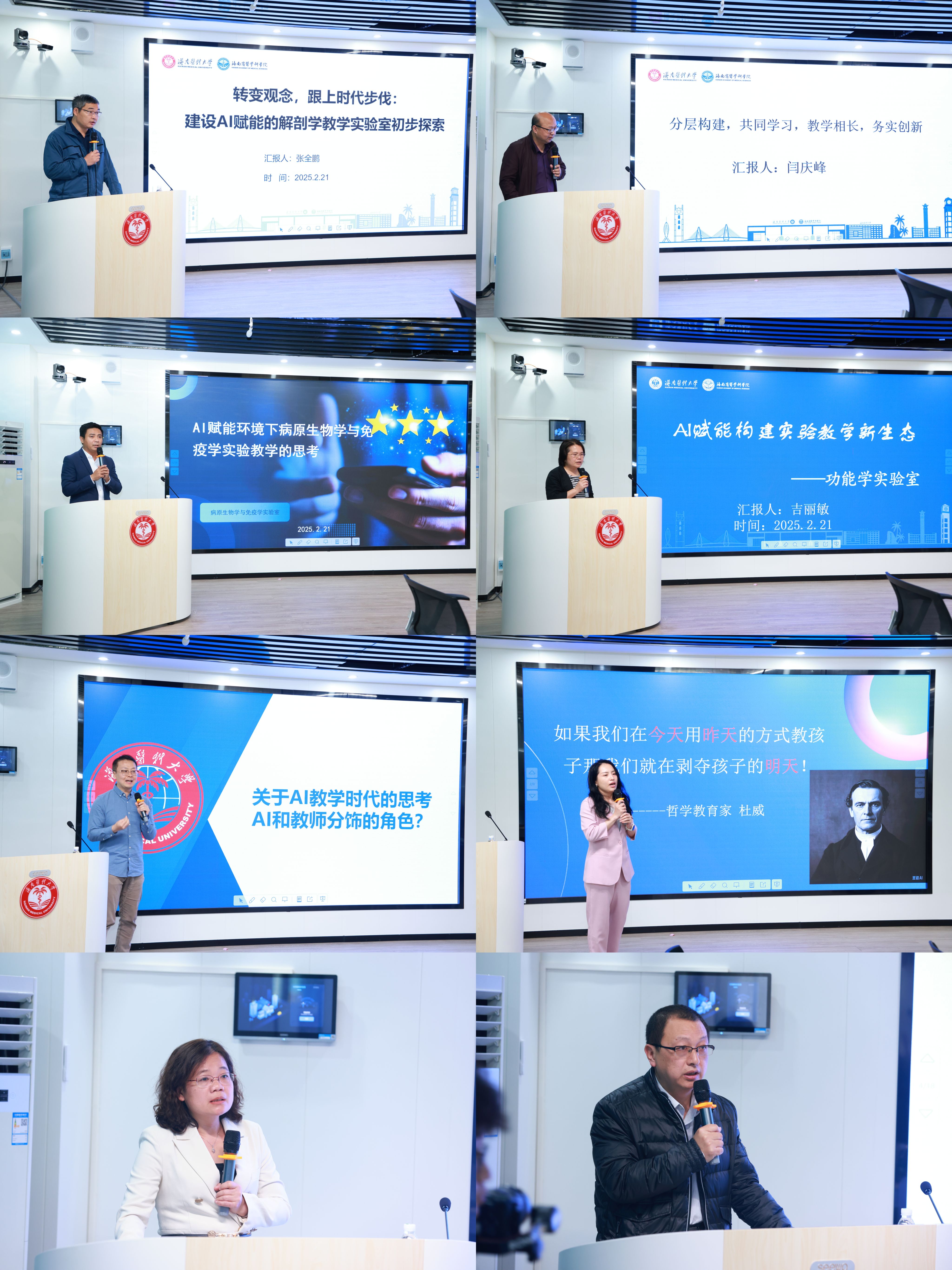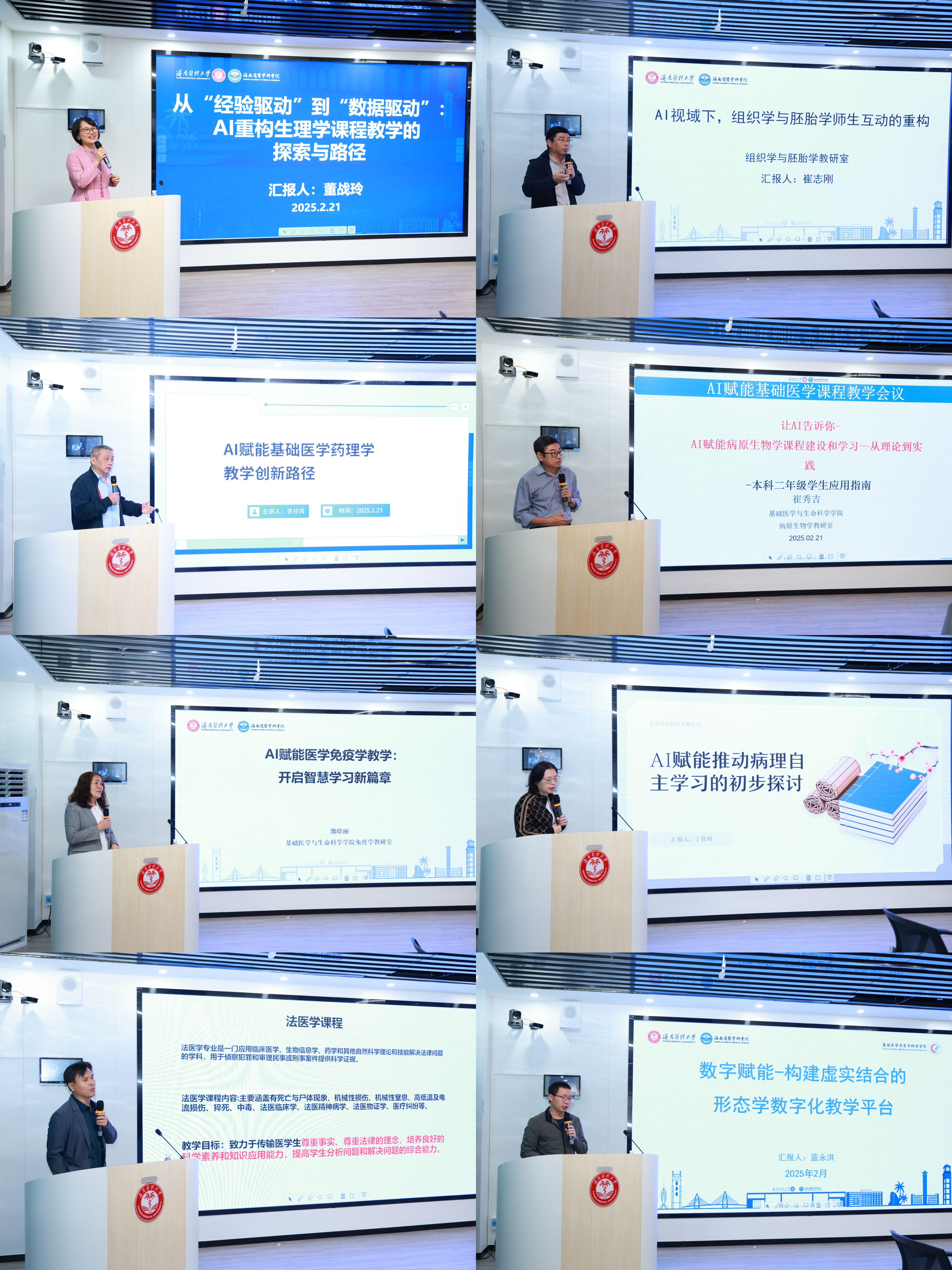 三级部门负责人结合学科特色提出实践路径,生理学董战玲老师、药理学曾祥周老师、病原生物学崔秀吉老师等以《从“经验驱动”到“数据驱动”:AI重构生理学课程教学的探索与路径》《AI赋能药理学教学:数据驱动的课程优化与个性化学习》《AI赋能病原生物学课程建设和学习—从理论到实践》为主题,围绕AI平台建设与教学模式革新,提出AI辅助学习应用场景示例;解剖学实验室张全鹏老师、功能学吉丽敏老师等建议构建“AI赋能虚实结合”的数字化平台,提升操作沉浸感和实验教学质量。