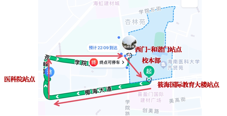 路线规划:由苍峄路海南省医学科学院(港岛花园新址),经停学院路taptap点点官网(西门-和谐门)站点,校内行驶至筱海国际教育大楼站点。再度往返至海南省医学科学院(港岛花园新址)站点接送,直至师生接送完毕。