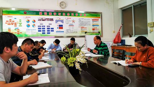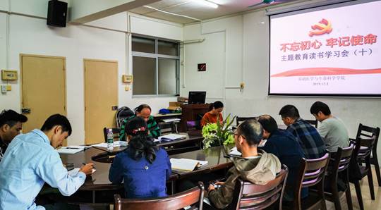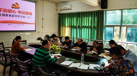 2019年12月3日上午,基础医学与生命科学学院党委在综合实验楼三楼会议室召开第十次“不忘初心,牢记使命”主题教育读书学习会,二级学院领导班子成员、党委委员及各支部书记参加了读书会。会议由学院李军副书记主持。由李军副书记对“高校基层党建工作标准化、规范化”、“海南医学院发展党员工作实施细则”文件精神进行解读,最后全体支部书记围绕“如何构建高校基层党建工作标准化、规范化”开展进行交流研讨。周代锋书记因参加学校举办的“不忘初心、牢记使命”主题教育第十次读书会暨学校党委理论学习中心组2019年第十四次集体学习研讨会而请假。