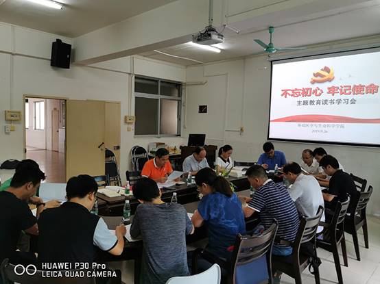2019年9月26日下午,基础医学与生命科学学院党委在综合实验楼三楼会议室召开“不忘初心,牢记使命”主题教育活动读书学习会,二级学院党委委员、领导班子成员及各支部书记参加读书会。会议由学院周代锋书记主持。