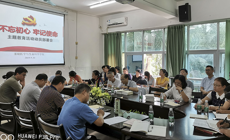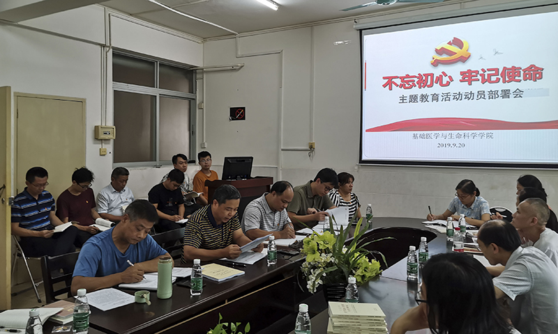 2019年9月20日下午,基础医学与生命科学学院党委在综合实验楼三楼会议室召开“不忘初心,牢记使命”主题教育活动动员会,除了有上课任务的党员教师外,其余党员教师全体参加。会议由学院李军副书记主持,周代锋书记传达了《海南医学院“不忘初心、牢记使命”主题教育实施方案》(taptap点点[2019]34号)文件精神,要求在我院全体党员中开展“不忘初心、牢记使命”主题教育,为提高广大党员干部自律意识,筑牢党员思想防线,扎实推进“不忘初心、牢记使命”主题教育活动的开展。