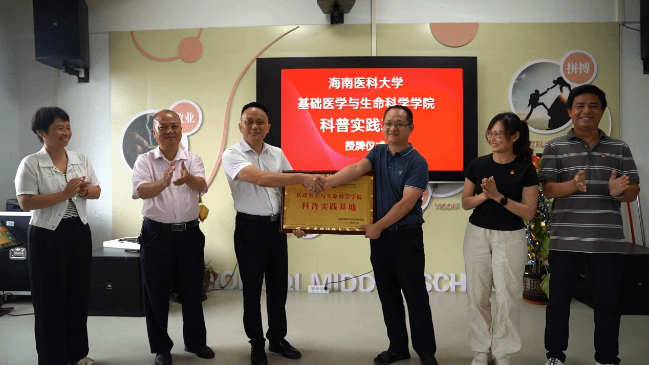 传承红色基因,弘扬科学精神,协力建设科技强国。9月20日上午8:30,江朝娜副书记、杜冠魁副院长带领学院7支教职工党支部队伍一行前往屯昌县开展医学科普服务活动,重点到屯昌县红旗中学开展了“大自然中的再生”“认识传染病”“乙肝病毒的防治”“眼保健”“认识肺脏 拒绝吸烟”“小小我的生长经历”“这些是毒品,不能碰”等7个主题的科普活动,科普内容丰富有趣,现场教学氛围活跃,学生积极参与互动,得到了红旗中学师生的肯定和赞扬。教师们也纷纷表示能将自己的知识传授给中学生是非常开心的事情。授课结束后,杜副院长也代表基础医学与生命科学学院向红旗中学授予基础医学与生命科学学院科普基地牌匾,标志着基础医学与生命科学学院的科普工作向更深层次发展,双方也就今后如何更好地开展科普工作做了深入的讨论。
