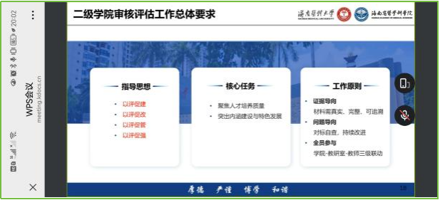 为保障本科教育教学审核评估工作有序推进,助力全院教职工明晰任务、高效协同,2025年6月25日,我院组织召开本科教育教学审核评估全院教职工线上培训大会。本次培训覆盖学院全体教师,共同聚焦审核评估工作要点,筑牢本科教育教学质量“检验防线”。