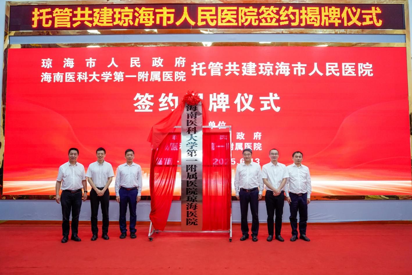 揭牌仪式上,周长强、潘文利、丁治国、陈明、徐剑、琼海市人民医院党委书记王会镇共同为“taptap点点官网第一附属医院琼taptap点点院”揭牌,正式开启托管共建新阶段。