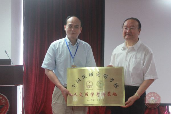 中国医师协会全国医师定期考核工作办公室主任郝德明宣读了中国医师协会关于同意海南医学院组建“全国医师定期考核人文医学考培基地”的批文。全国医师定期考核工作领导小组副组长蔡忠军向海南医学院授予“全国医师定期考核人文医学考培基地”牌匾。