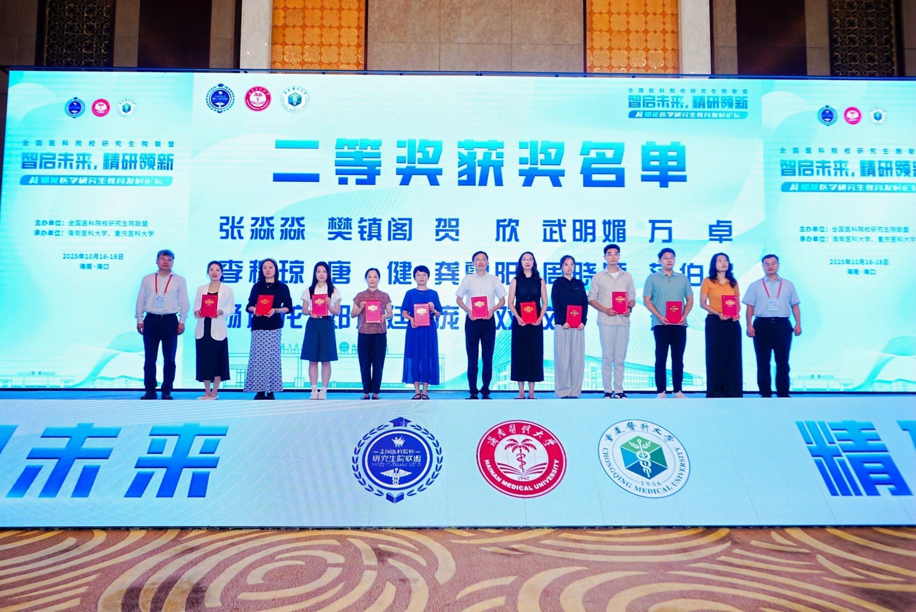 在优秀论文颁奖环节,刘锦、李渝凤、黄斌文、河北医科大学副校长闫宝勇、河南医药大学副校长姬广军、全国医学专业学位研究生教育指导委员会秘书处办公室主任贾金忠为优秀论文获奖者颁发荣誉证书。