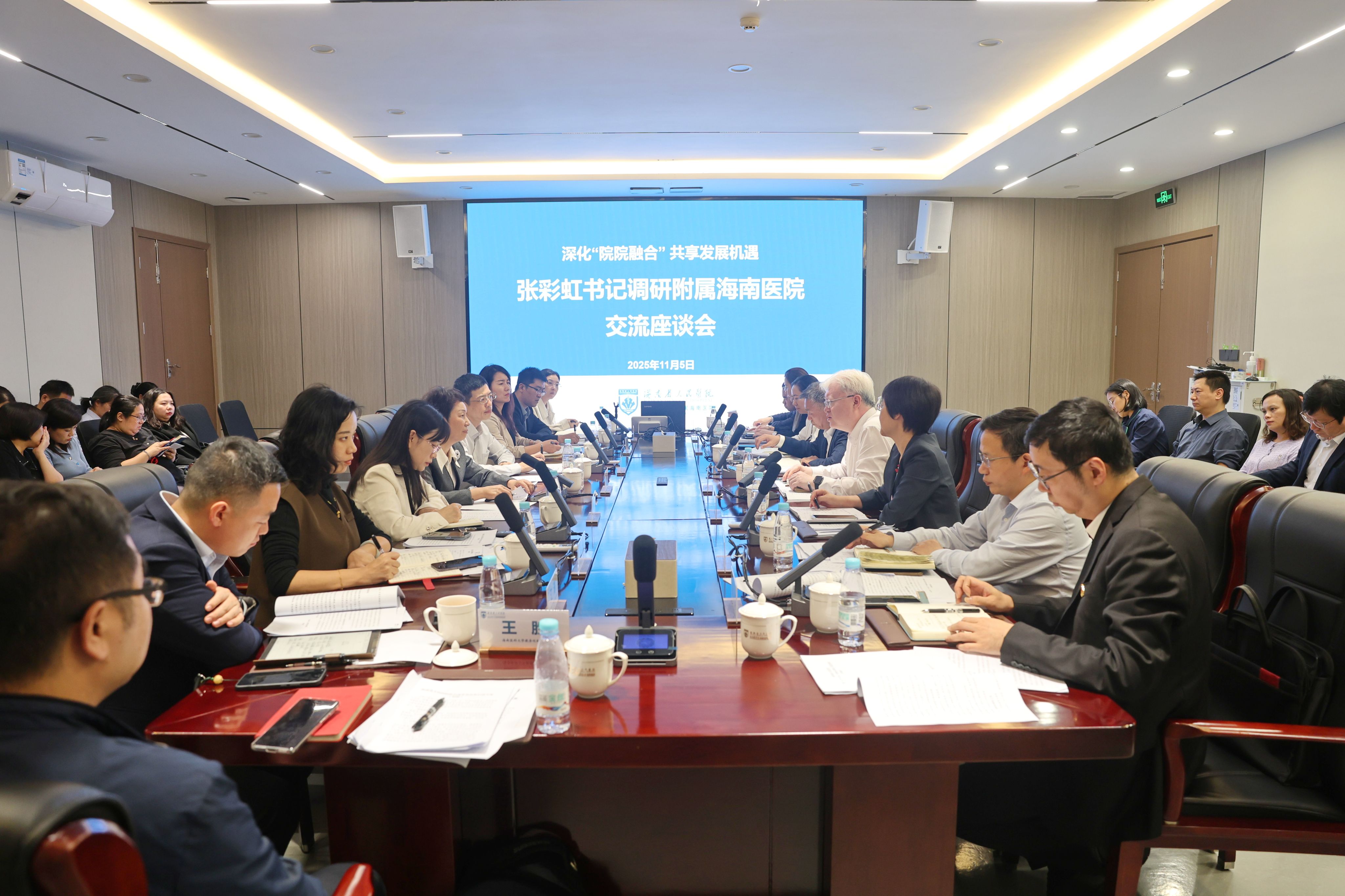 在附属海南医院,张彩虹高度评价了医院领导班子及全院职工在学校和医院改革发展、自贸港建设以及“大病不出岛”目标中展现出的担当,同时指出医院在与学校战略协同、资源共享、管理运行、人员交流及文化认同感等方面还存在着亟待提升的空间。