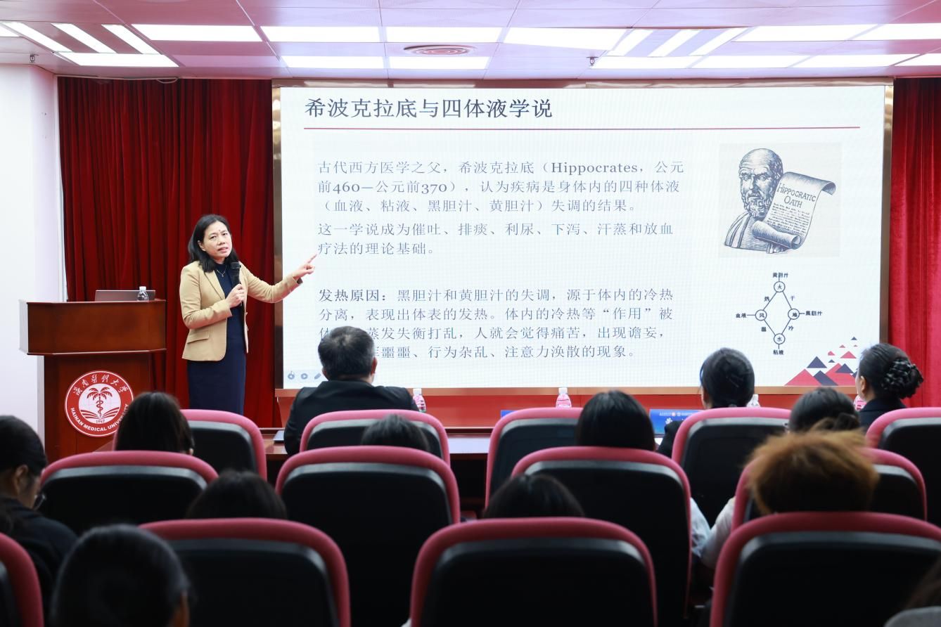 在核心主旨报告环节,甄橙教授以《人类与发热疾病的抗争——医学史视角的思考》为题展开分享。她从古代对发热疾病的认知溯源,梳理了伯罗奔尼撒之战瘟疫、黑死病、西班牙流感等重大热病的历史影响,详解了人痘与牛痘接种术的推广、体温计的发明与热型诊断,以及放血疗法、奎宁、阿司匹林等退热手段的演变历程。兼具学术深度与历史厚度的讲解,让在场师生跳出课本理论,真切体悟到医学进步背后的坚守与牺牲。