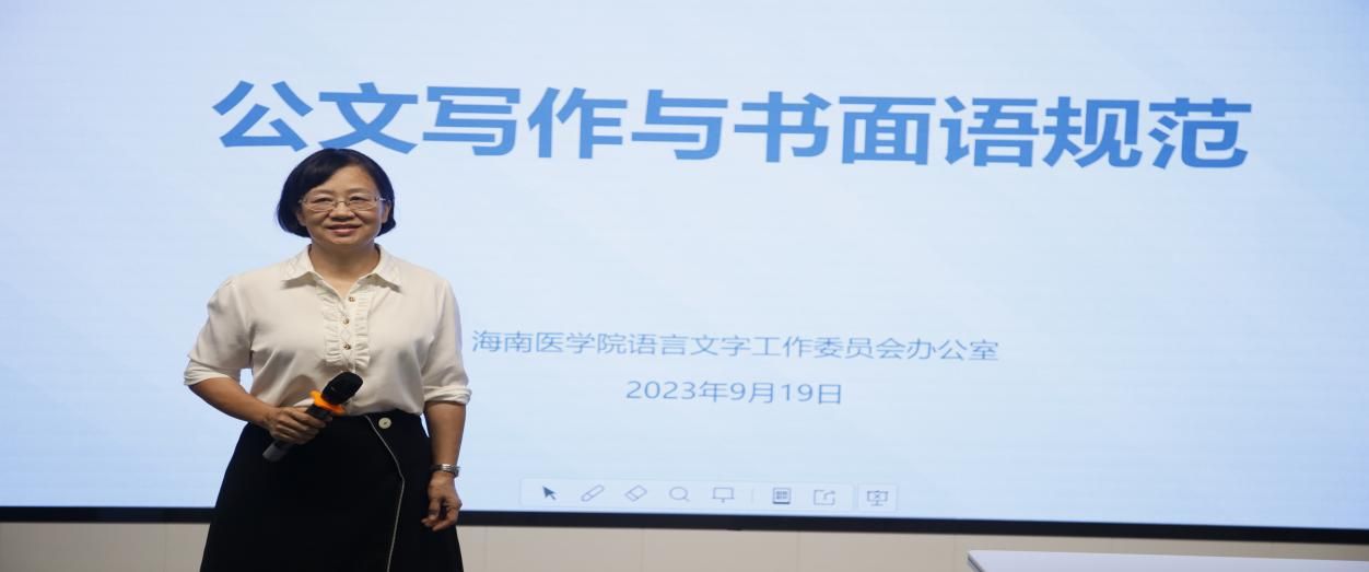 为进一步提高taptap点点干部公文写作能力,掌握公文写作格式规范及书面语规范。2023年9月19日下午,海南医学院语言文字工作委员会办公室在笃行楼七楼学术报告厅组织开展语言文字工作能力提升培训专题讲座。此次讲座邀请海南省语言文字工作专家组核心成员、琼台师范学院周萍教授授课。各二级单位语言文字联络员、党政办公室主任、教学办主任、二级学院团委、学工办负责人以及学生助理等近120人参加讲座。