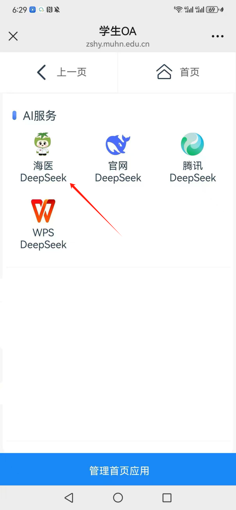 学生 访问掌上taptap点点公众号 → 进入「学生OA」 → 「AI服务」栏目 → 点击「taptap点点DeepSeek」(图标为taptap点点吉祥物)
