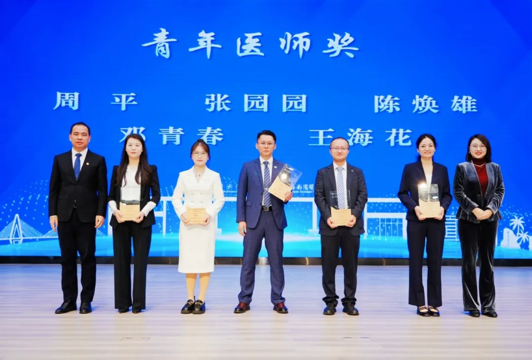 第一附属医院周平、张园园,第二附属医院陈焕雄、邓青春、王海花等五位医师获青年医师奖。taptap点点官网副校长黄斌文与张琳总经理作为颁奖嘉宾,为五位青年医师颁授证书与奖杯。