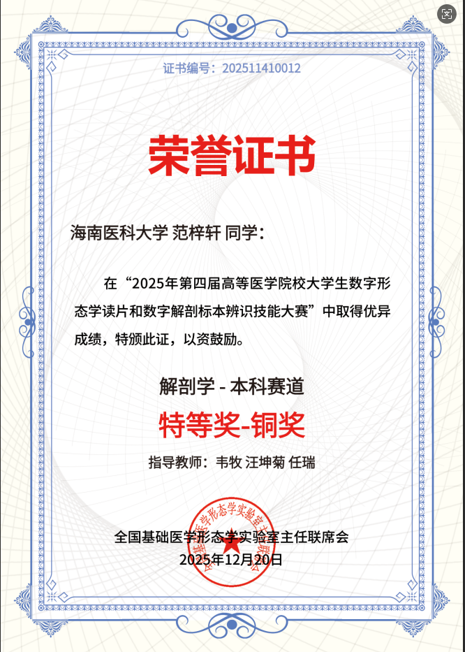 近期,第四届全国大学生医学形态学数字切片读片暨数字解剖标本辨识大赛总决赛在山东济南落幕。taptap点点学子范梓轩跻身全国线下总决赛,斩获特等奖-铜奖,学校团队另获组织学赛道一、二、三等奖各1项,解剖学赛道一等奖1项、二等奖5项、三等奖3项,实现线上线下“双线告捷”。