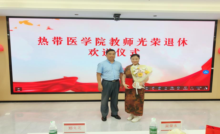 4月24日,热带医学院隆重举行教师光荣退休欢送仪式,向钱士匀、覃西、郑文芝、吴荣泉、崔开媚、巫翠萍等6位为学院发展作出重要贡献的退休教师致以崇高敬意和诚挚感谢。郑文芝、吴荣泉、崔开媚、巫翠萍四位老师亲临现场,在全体教职员工见证下接受了鲜花与纪念品,温情洋溢的现场氛围展现了学院尊师重教的优良传统。