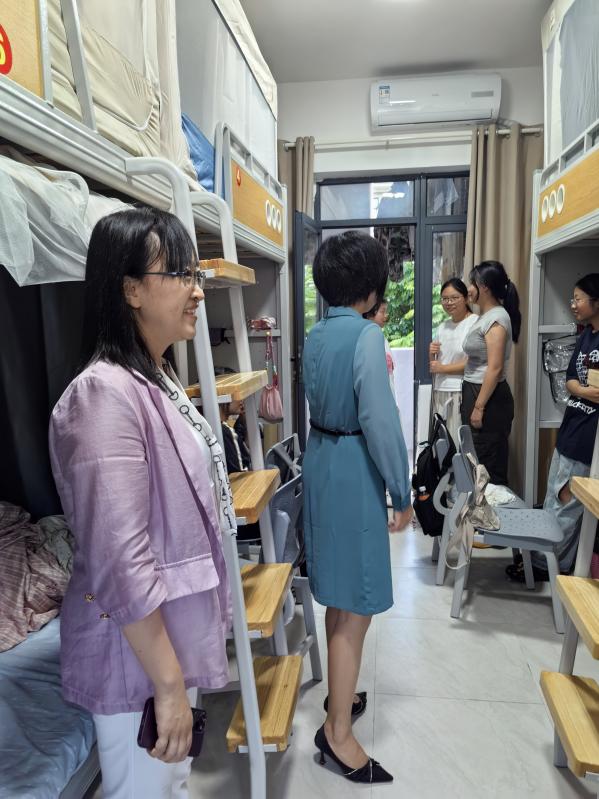 课堂巡查后,郭向、朱敏及新生辅导员走进学生宿舍,细致排查消防安全隐患,查看用电安全、卫生状况,向同学们强调宿舍安全的重要性,提醒大家增强安全防范意识,共同维护整洁、安全、和谐的“第二家园”。