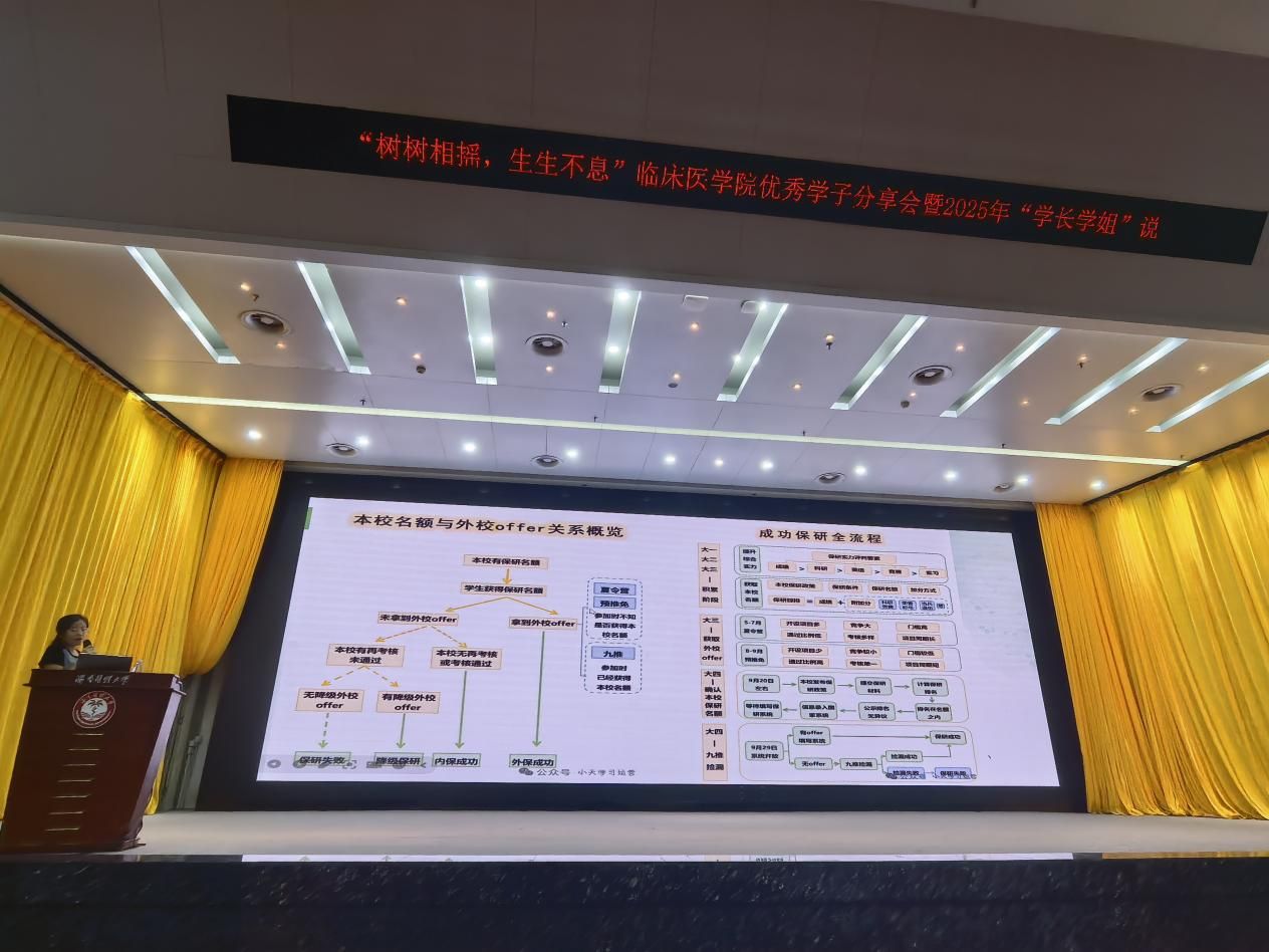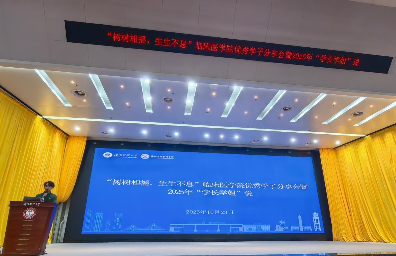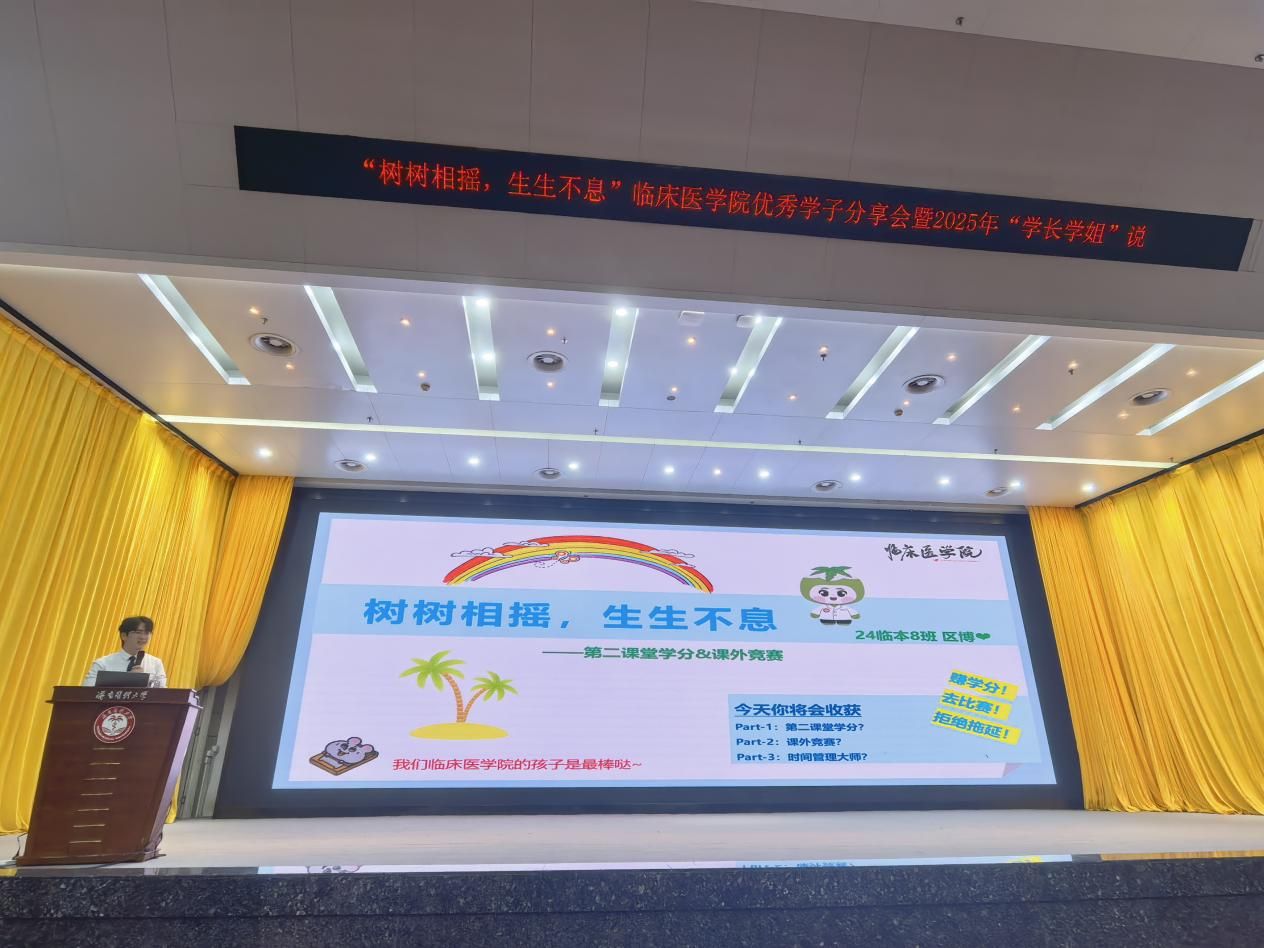 金秋送爽,丹桂飘香,薪火相传,筑梦启航。10月23日晚,临床医学院在立德厅举办“树树相摇,生生不息”优秀学子分享会暨2025年“学长学姐说”活动。本次活动作为新生入学教育的重要一环,特邀五位在学业科研、临床实践、综合素质等方面表现突出的学长学姐,与现场四百余名大一新生展开深入交流,共同谱写了一场关于成长、关于梦想、关于传承的青春盛会。