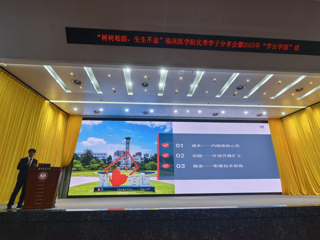 已入职海南省人民医院放射科的夏伟祥从“知行合一”的角度出发,分享了临床实践与职业发展的经验。他详细讲述了如何主动寻找并把握临床见习与科研实践的机会,将课堂理论知识转化为实际工作能力。作为影像技术专业的优秀毕业生,他还深入剖析了该领域的就业前景与发展路径,为同学们打开了更为广阔的职业视野。他的分享既有理论高度,又贴近临床实际,帮助同学们对未来的职业规划有了更清晰地认识。