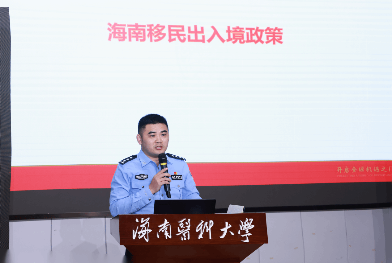 10月28日,海口市公安局詹家仪、徐槐两位警官应邀为西英格兰学院(国际教育学院)国际学生作专题宣讲。詹家仪解读海南自贸港签证政策,鼓励同学们专注学业、争取“五星卡”,并提醒同学们及时办理签证、严禁非法打工、远离毒品。徐槐则围绕校园安全、防诈骗和“三非人员”识别等进行案例教学。