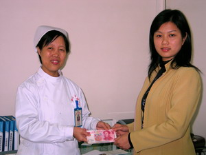 海啸无情,人有情。元月六日下午,附院门诊部医务人员自发地为印度洋地震海啸灾民捐款785.00元(人民币)。图为羊翠芬护师将捐款送交工会王爱同志手中。