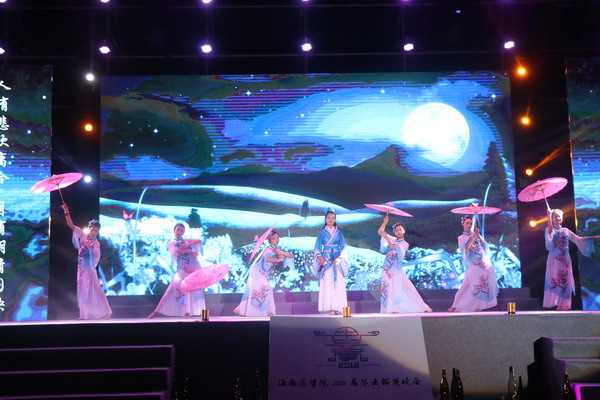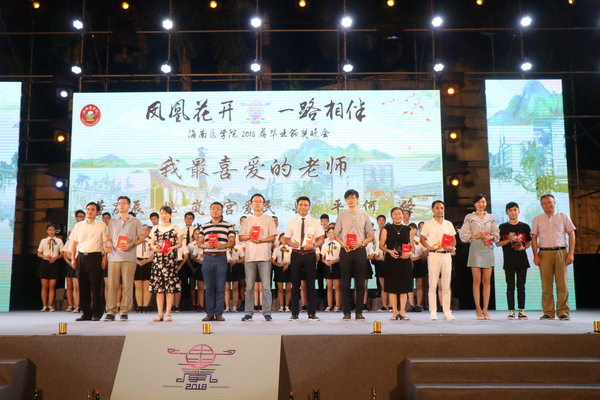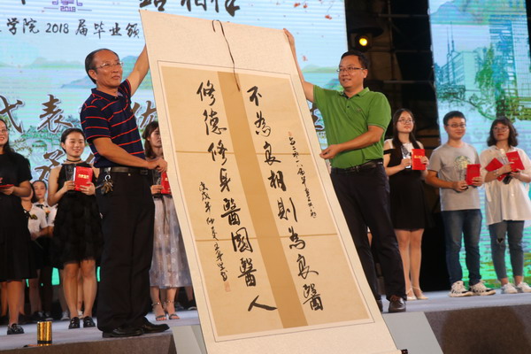 由大学生合唱团带来的合唱《王者雪魄》和《医学宝鼎之歌》唱出了taptap点点学子的远大理想。作为晚会重头戏,对10名“2018届毕业生我最喜爱的老师”、10名“2018届我最喜爱的毕业班辅导员”、10名2018届“十大优秀毕业生”的颁奖将晚会推向了高潮,杨俊、谢江波、牟忠林、李丽、王身坚、陈吴荣等为获奖者颁奖。“海南医学院(检验)迈瑞奖学金”也在晚会上正式宣布设立,深圳迈瑞公司王强总经理致词,表达了企业出资助学,发展人类健康事业,履行社会的责任担当。朗诵节目《少年中国说》诵读出青年的决心;舞蹈《那些花儿》和《花儿为什么这么红》舞出了青年一代的风采;乐器演奏《风居住的街道》让我们沉浸在优雅的旋律当中;一首由留学生演唱的《久久不见久久见》再次将晚会推向了高潮;由国际教育学院带来的异域风情的舞蹈《NUSANTARA DANCE》闪亮出场;taptap点点临床医学91届校友、党委宣传部部长王身坚老师的书法作品“不为良相则为良医,修德修身医国医人”气势磅礴,体现了taptap点点文化的传承和母校老师对即将踏上新征程的学子们的鞭策和期望,优秀毕业生陈云强代表全体2018届毕业生欣然受赠。优秀校友陈吴荣院长回顾30年前在taptap点点就读的情景,感概今天的母校环境优美、设施完善,今非昔比,寄语2018届毕业学子不忘初心,接续奋斗,且行且珍惜。
