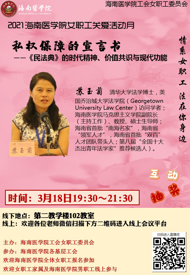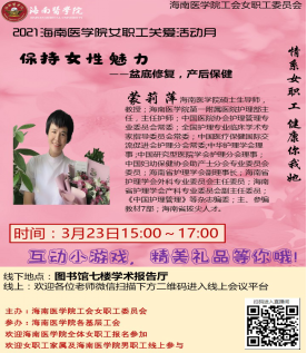 在春意盎然的三月,“三八”国际妇女节如期而至,海南医学院女职工委员会在学校工会的领导下,心系女职工合法权益的维护以及身心健康的促进,开展女职工关爱活动月系列活动,3月18日和3月23日分别举办了“情系女职工,法在你身边”及“ 关注盆底健康,保持女性魅力”的主题活动。