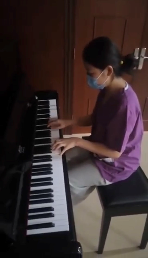 午休时间,核酸采集人员分组轮换,这是一天中“大白”们唯一可以稍事调整的时间,正巧我院眼科的邢悦所在的海南省农垦直属第二小学核酸采集位点的工作人员临时休息区设在会堂,饭后她便演奏了一曲《River flows in you》,缓解了疫情防控工作中大家紧张焦虑的心情。整齐划一的防护服下,藏不住的是“大白”们可爱又有趣的灵魂。