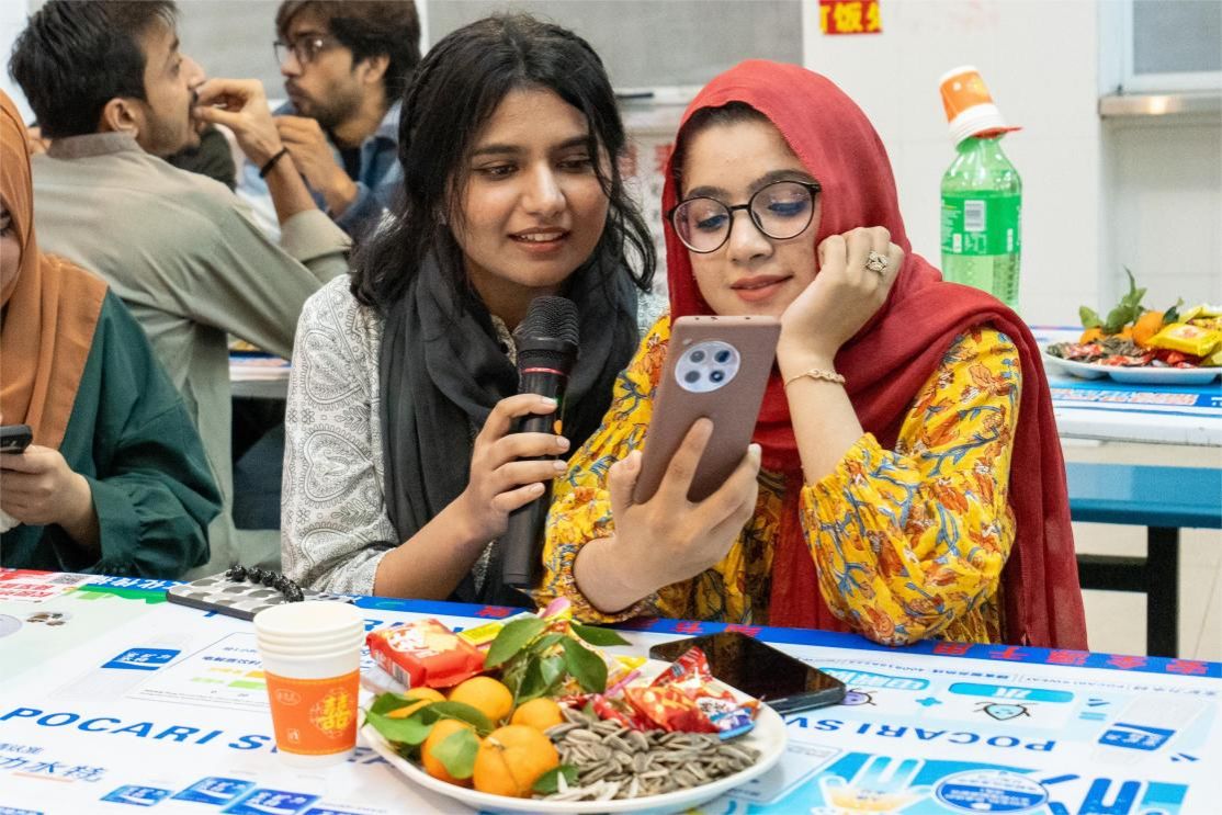 同学们边听歌边聊天,分享彼此在中国的生活和学习经历,讲述着有趣的故事。来自巴基斯坦的学生方善为大家演唱了歌曲《童话》,来自科摩罗的学生何玲珑演唱了一首《如愿》,她说:“这首歌里饱含了对国对家的深情,我太喜欢了。”两名巴基斯坦的女孩子一起哼唱着《甜蜜蜜》,伴随着欢快的旋律,每个人脸上都洋溢着满足和幸福的笑容。