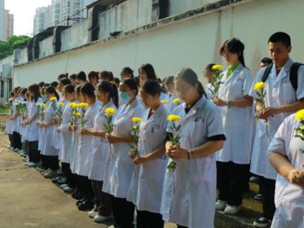 随后,全体师生在实验动物纪念碑前举行了简朴而又庄重的默哀和献花仪式,共同祭奠为人类医学事业作出伟大贡献的实验动物们。