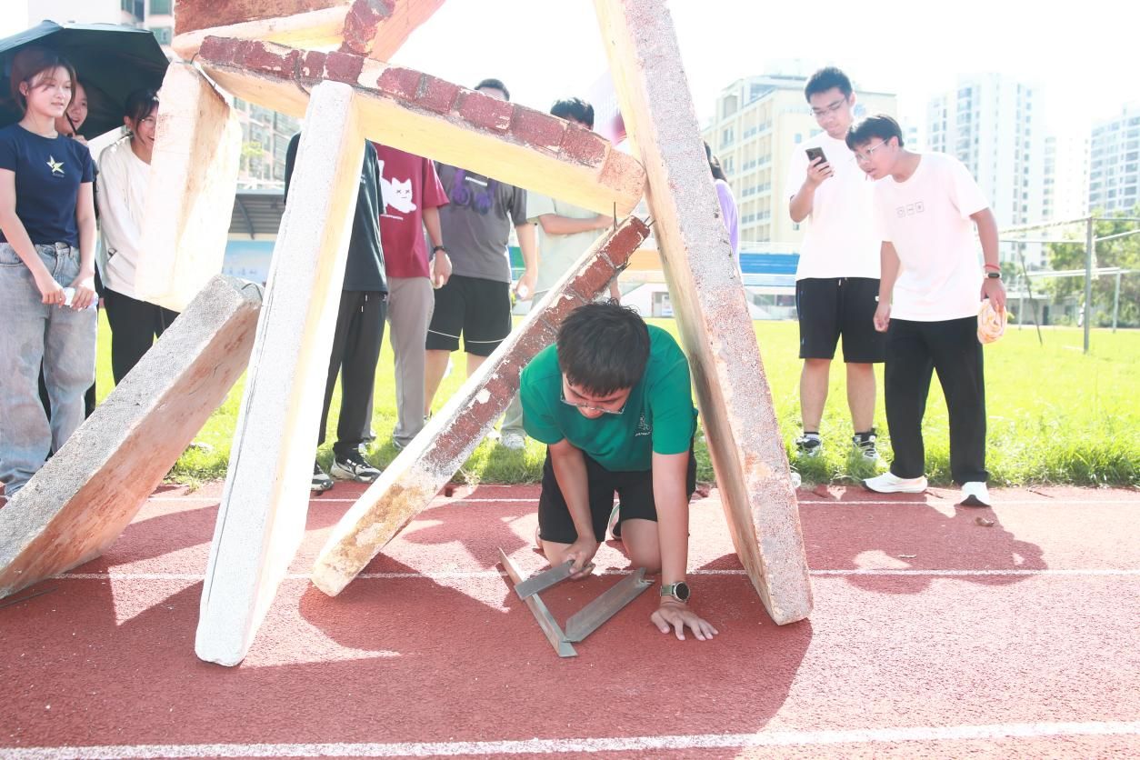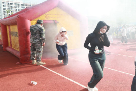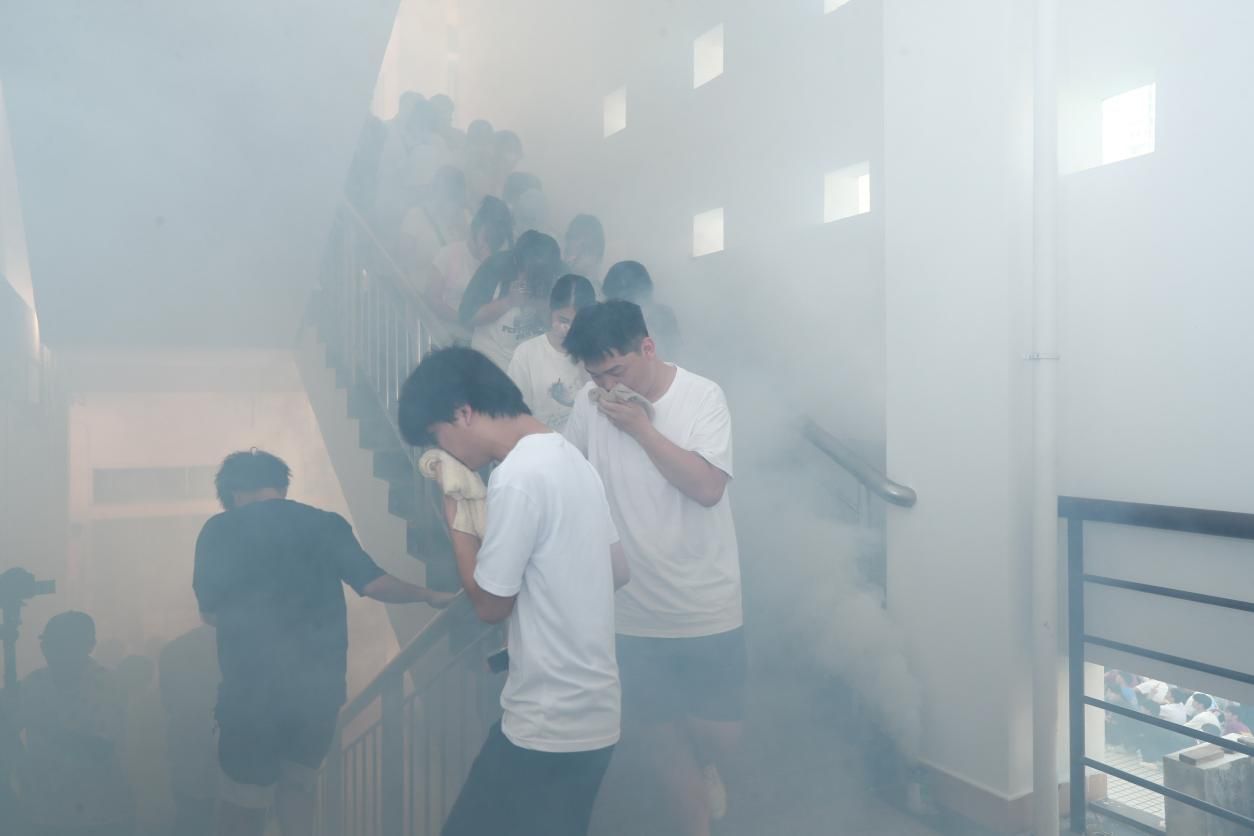 随着警报响起、烟雾弥漫,同学们在安全指挥教官的引导下,用湿毛巾捂住口鼻,弯腰低姿从火灾模拟房中有序“逃生”。20余名教官分组带领新生完成“烟道逃生”“高楼逃生应急”“灭火器识别及实操”“室内快速疏散撤离”“地震废墟下自救互救”等五项应急逃生演练。“教官讲解演示+同学实践操练”的教学方式让同学们沉浸式体验应急灾难现场,熟练掌握应急处置能力。