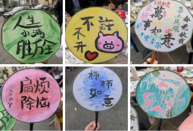 此外, 临床医学院的同学们和国际教育学院的留学生为居民们绘制了各式各样的团扇,表达着对美好生活的向往和新年的期待。团扇作品受到居民们的一致好评,也吸引了很多小朋友,他们拿起桌上的彩笔,认真地绘制独属于自己且充满想象力的团扇。同时,语委办也向居民们发放语言文字宣传手册和朗读手册,帮助居民们深入了解语言文字的内涵,营造良好的社区文化氛围。