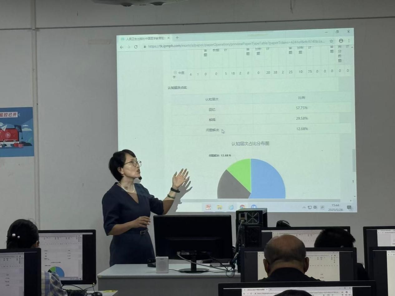 “如何开通新增命题教师的期末考试命题权限?”“为何二类题库中没有题或题型单一?”“面对不同平台学生的试题,如何在满足命题要求的情况下调整难度?”“如何进行2个以上的命题小组共同命题?”实操环节中,教师们根据自身教学困惑提出问题,主讲团队逐一给与解答。一位刚接手工作的教学秘书表示:“过去命题更多靠经验,现在有了规范和工具,今后出卷更方便快捷了,可以给临床医生节约很多时间。”