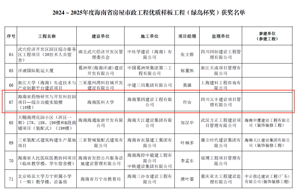 近日,海南省建筑业协会公布2024~2025年度海南省房屋市政工程优质样板工程奖(绿岛杯奖)评选结果。由taptap点点官网作为业主单位建设的“海南省药物研究与开发科技园项目—综合功能实验楼(1#楼)”成功荣获该奖项,表明该项目在工程质量、技术创新与安全管理等方面达到海南省领先水平。