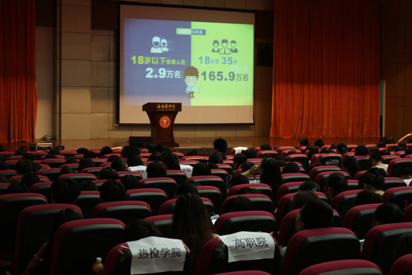 观影前现场还播放了禁毒宣传片。据了解,截止2014年底,全国累计发现登记18岁以下吸毒人员2.9万名,18岁到35岁吸毒人员165.9万名,35岁以下吸毒人员占在册吸毒人员总数的57.1%。在2014年新发现的吸毒人员中,18岁以下吸毒人员1.8万名18岁到35岁吸毒人员占近7成。我国传统毒品滥用形势也从传统毒品过渡到合成毒品。目前,吸毒人群正趋向于低龄化、多元化和毒品多样化。合成毒品通过刺激人的大脑神经对人形成精神上的控制而导致成瘾,它可以对大脑神经产生直接伤害是吸食者兴奋、致幻,而青少年正在成为合成毒品泛滥的最大受害者。