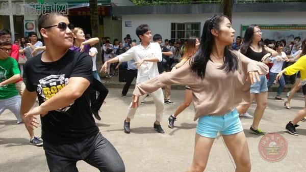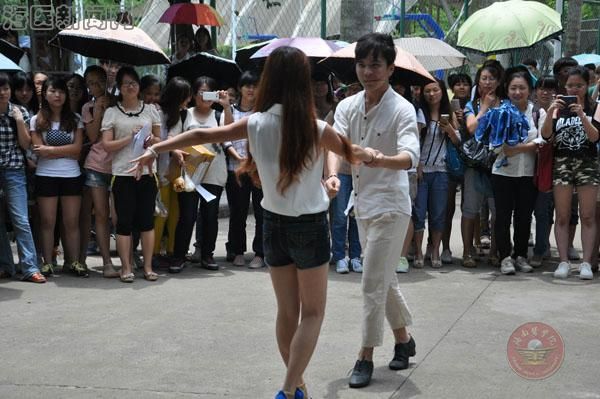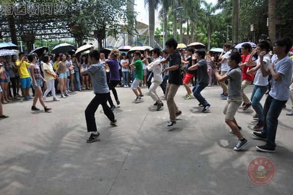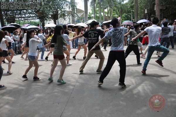 正午十二点的钟声过后,一上午的教学活动结束了,同学们从各教学楼涌出来。在行走的人群中突然出现一名学生,伴着激昂的音乐跳起了富有节奏的爵士舞,一开场便赚取了过往师生的眼球,纷纷驻足并拿手机拍摄。从行走人群中走出来的学生越来越多,两名、十名、近五十名学生涌现出来和着音乐整齐划一地跳了起来,进而,交谊舞、各式街舞次第登场。他们灵动优雅的交谊舞带给现场观众别样的静美,忽而高亢动感的街舞又将现场气氛带入了高潮,活动中穿插的PSY、Gentleman等舞蹈的展示更是赢得了观众的阵阵掌声。