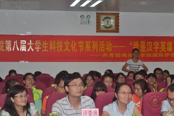 海南医学院第八届大学生科技文化艺术节系列活动之“我是汉字英雄”总决赛于2014年10月18日晚7点半在图书馆七楼学术报告厅拉开了序幕。比赛邀请了组织人事部雷浩泽老师和学工部张贞云老师担任评委,校团委符琬聆书记、王鹏老师和各二级院系团委书记出席了比赛。