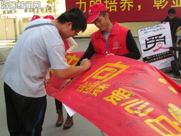 志愿者们分别在商业街小卖部旁边、学校三四期公寓进行宣传。用“烛光红丝带”和海报、人体行为艺术、横幅签名、歌曲演唱、红丝带的佩戴等形式向同学们宣传艾滋病的预防知识;在11月30日晚上的活动中,邀请海南省广播电视台人员对我们此次活动进行报道,从而扩大宣传,让社会上更多的人了解艾滋病的危害性以及如何预防艾滋病。