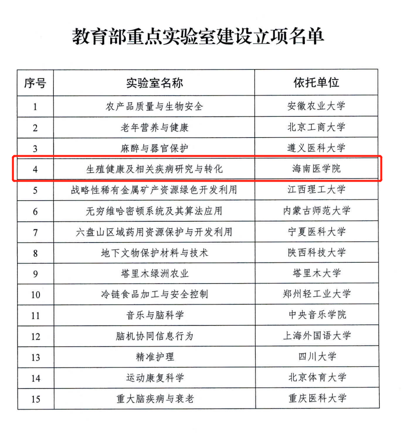 此次获批培育建设的“生殖健康及相关疾病研究与转化重点实验室”将聚焦于辅助生殖、干细胞治疗及基因治疗等国际前沿新技术,通过建立从基础研究到疾病诊疗,从自主创新性研究到临床转化的生殖健康及相关疾病研究的转化高地,以提高海南省生殖健康水平,加强出生缺陷防治,争取获批国家级临床医学研究中心,建成比较有国际影响力的教育部生殖健康及相关疾病研究与转化重点实验室、同时为促进海南自贸港相关基础研究、人才培养和国际交流发挥示范作用。教育部重点实验室是高校“双一流”建设的重要载体,是国家科技创新体系的重要组成部分,也是高等学校创新性人才的培养基地,在高校学科建设、科技创新、人才培养和培育国家级科研基地中发挥着越来越重要的作用。此次获批立项建设的教育部重点实验室进一步丰富了海南医学院科学研究领域。学校将加大对重点实验室“人财物”的支持力度,力争在建设期中获得更大的提升,为海南医学院建设热带特色鲜明的国际化高水平医科大学提供又一个有力科技平台支撑。
