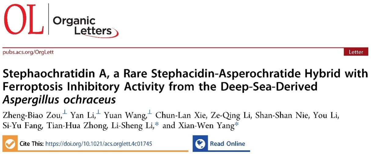 6月24日,海南省医学科学院杨献文研究员和福建医科大学李立胜副教授合作在《Organic Letters》在线发表题为 “IStephaochratidin A, a Rare Stephacidin-Asperochratide Hybrid with Ferroptosis Inhibitory Activity from the Deep-Sea-Derived Aspergillus ochraceus”的论文。