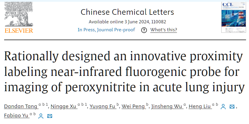 6月3日,急诊创伤学院于法标教授团队在《Chinese Chemical Letters》在线发表题为“Rationally designed an innovative proximity labeling near-infrared fluorogenic probe for imaging of peroxynitrite in acute lung injury”的论文。