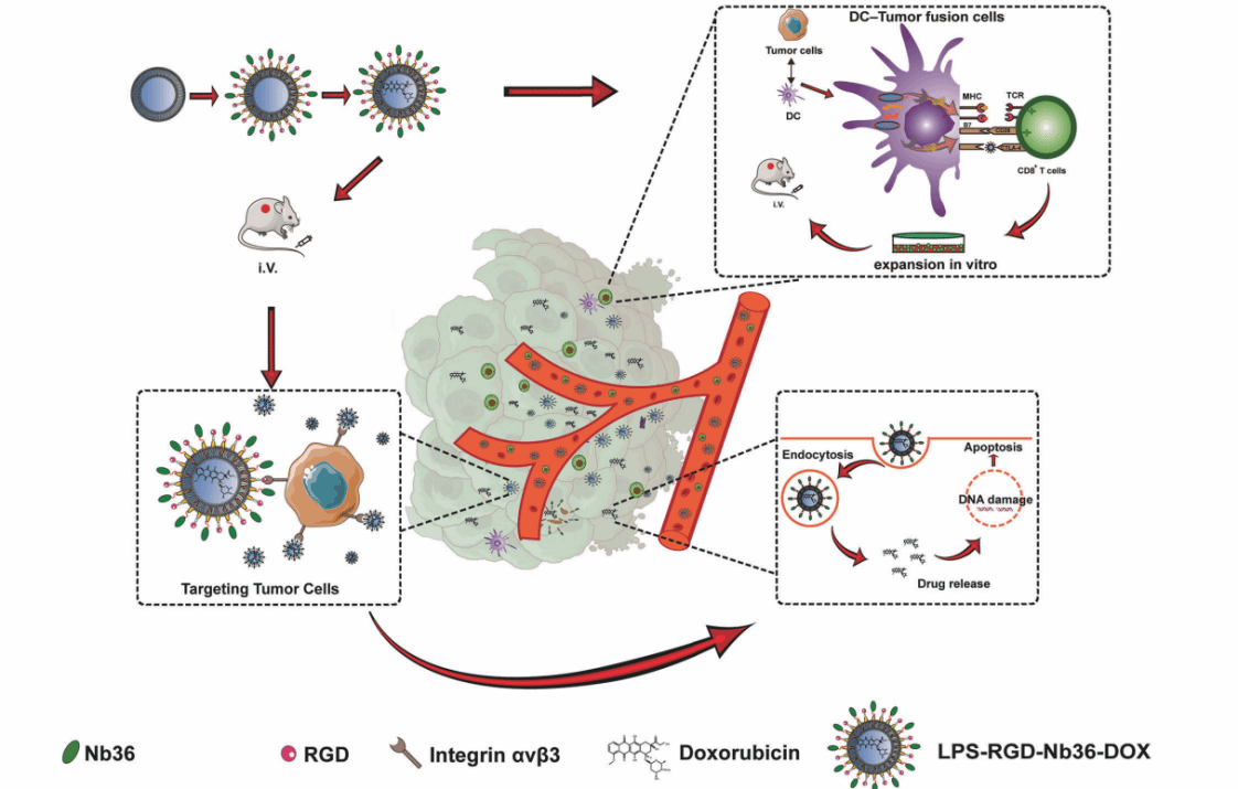 纳米抗体(Nb)是一种由骆驼科动物体内天然存在的特殊单链抗体(缺失轻链和 CH1),经克隆其可变区后得到的单域抗体,是目前发现的分子量最小的抗原结合单元,具有高稳定性、强抗原结合能力、低免疫原性和强组织穿透能力等优点,在恶性肿瘤的诊断和治疗方面具备了巨大的潜在价值。在前期研究中,该课题组应用噬菌体展示技术筛选到一组靶向CTLA-4的Nb(Nb36),显示出具有显著的稳定性和特异性。前期研究还发现Nb36能靶向结合DC细胞表面的B7分子,阻断T细胞CD28/B7信号通路形成的竞争性抑制,进而上调T细胞的增殖与活性。本研究利用脂质体独特的双分子层结构,构建CTLA-4 Nb和多柔比星双载药系统(LPS-RGD-Nb36-DOX),能将DOX更高效运输到肿瘤局部,同时激活肿瘤局部的T细胞。研究结果表明该疗法形成的肿瘤特异性T细胞可在体外/体内高效杀伤肿瘤靶细胞,具有更强的增殖和细胞因子分泌能力,同时结合了免疫细胞过继治疗可显著降低DOX用量,减少化疗药物的毒副作用,具有更好的临床应用安全性。