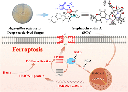 Stephaochratidin A (1)是从深海真菌Aspergillus ochraceus MCCC 3A00521中发现的新颖骨架化合物,是一个罕见的异戊二烯基吲哚生物碱stephacidin与C9聚酮asperochratide的杂合体。对化合物Stephaochratidin A (1)的生物学活性进行筛选,发现其在多种细胞系中对铁死亡诱导剂RSL3、 Erastin和FINO2诱导的铁死亡均有一定的保护性。对Stephaochratidin A (1)抑制铁死亡的机制开展研究时,发现在体外Stephaochratidin A (1)不具备抗氧化剂和铁螯合的活性,但能够抑制细胞内的脂质氧化。进一步的研究表明Stephaochratidin A (1)能够抑制RSL3诱导的血红素加氧酶HMOX1基因的表达从而抑制铁死亡,详细揭示了其作用机制。、