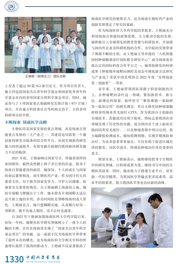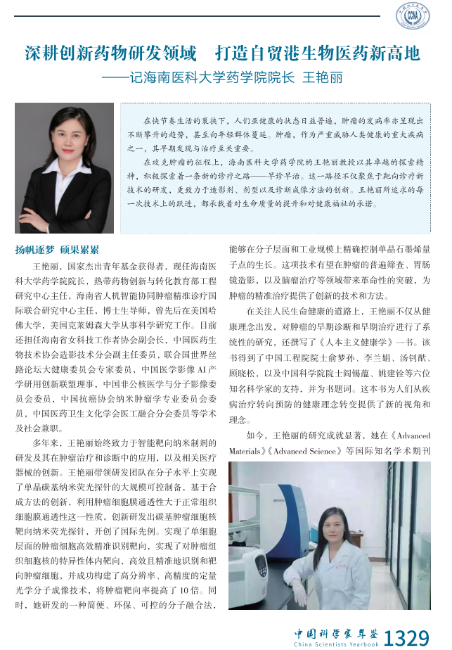 近日,药学院院长王艳丽教授以其在生物医药领域的杰出贡献,入编并荣登2024年度《中国科学家年鉴》封面人物。这一殊荣不仅是对王艳丽教授个人科研成就的高度认可,更是对她带领团队在科技创新领域作出贡献的充分肯定。