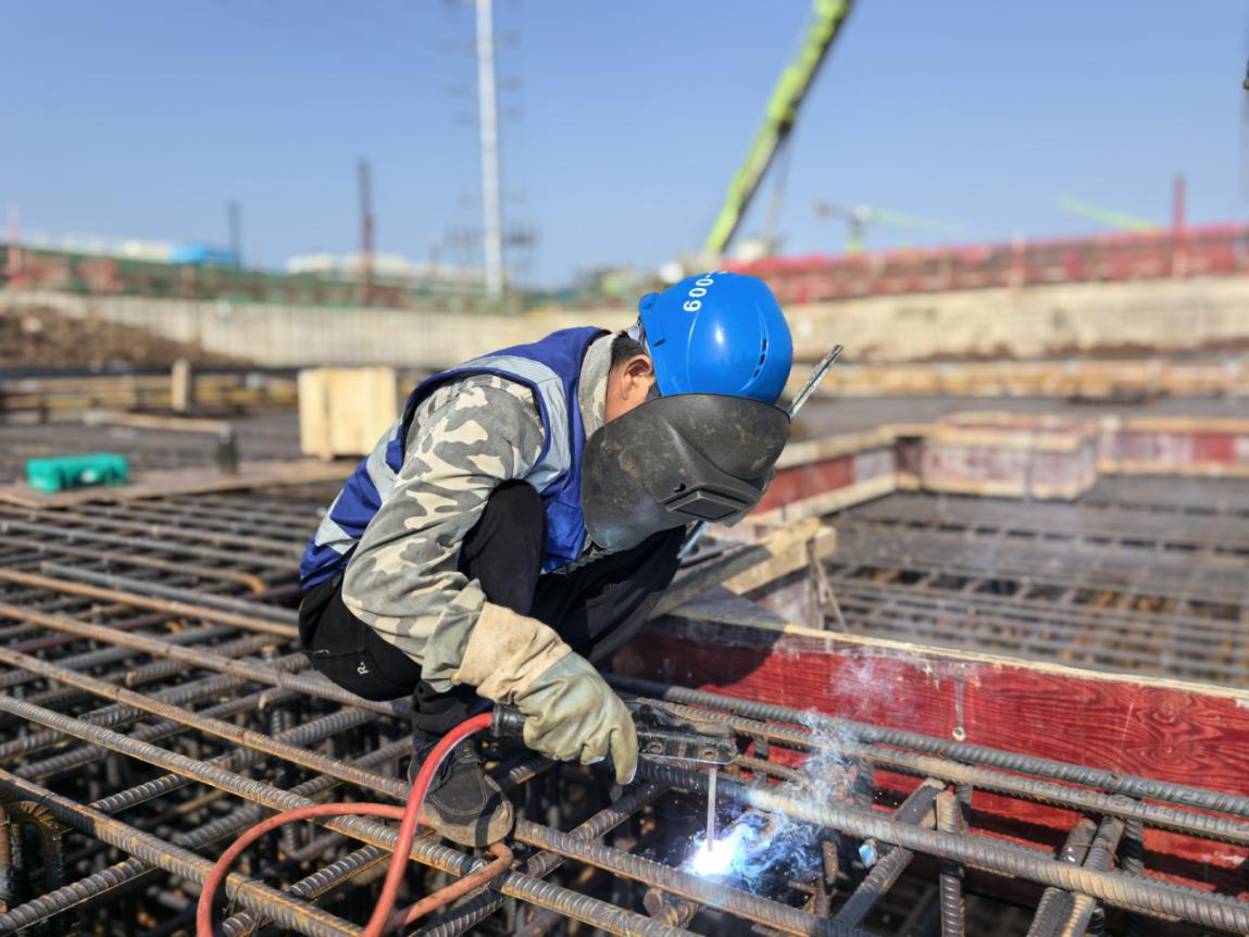 施工现场,焊花飞溅,机械轰鸣,繁忙的工程车穿梭不停,塔吊挥舞巨臂运送材料,工人们挥汗如雨,一派繁忙景象,处处都能感受到项目建设的“速度”和“热度”。