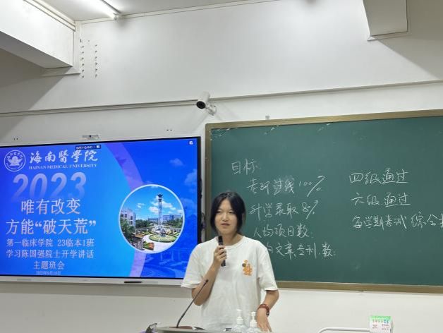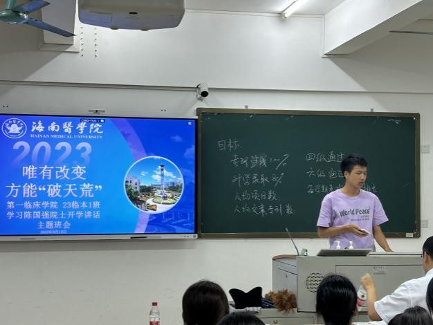 “千磨万击还坚劲,任尔东西南北风。”看着黑板上的目标,听了辅导员、班主任和同学们的肺腑之言,来自广西的黄培怡同学也有所收获:“校长的发言涵盖了多个层面,但让我感触最深的是在校长的发言中,多次出现了‘敢’这个关键字。虽说‘轻舟已过万重山’,但回想高考时,我自认确实缺少了些许勇气。而在充满机遇的大学,我希望我不会再次丢掉勇气。我认为,作为2023级新医科班新生,‘敢作敢为’是我们打破桎梏,激昂前进的首要准则。看着身后黑板上的目标,想要完成并不容易。这时,就需要我们以‘破天荒’的勇气,以热血冲铸的头脑以及勇往直前的心志乘风破浪,齐头并进。因此,我希望我能与班级一起,打开心扉,勇往直前,敢说敢做,携手走向成功!”