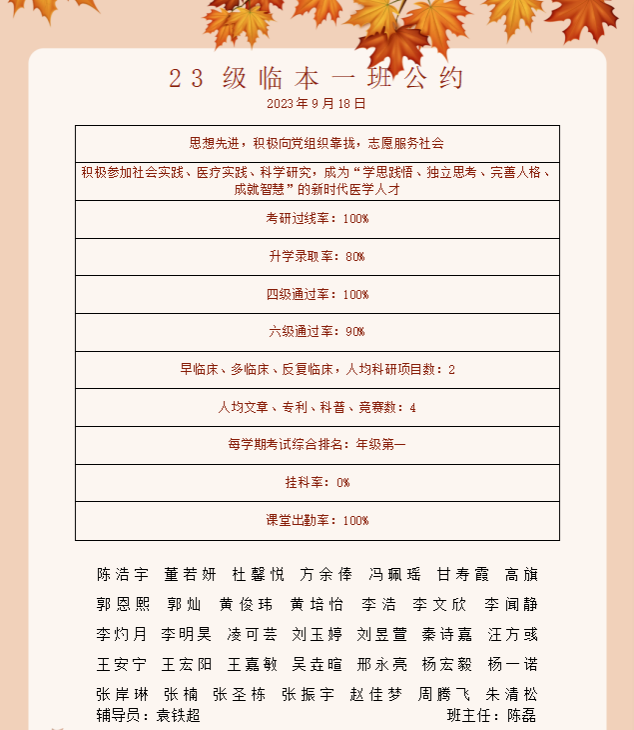 最后,在23临本1班班长周腾飞的带领下,全班35名同学立下了《23临本一班公约》,不啻微芒,造炬成阳,周腾飞表示立下《公约》后全班上下在接下来的日子里一定会将陈国强院士的讲话和要求贯彻执行,牢记“不为良相,则为良医”的嘱托,将梦想化作信念和使命,相信我们定能“画凌烟,上甘泉”,实现“遥遥领先”,恣意纵横九天之上!